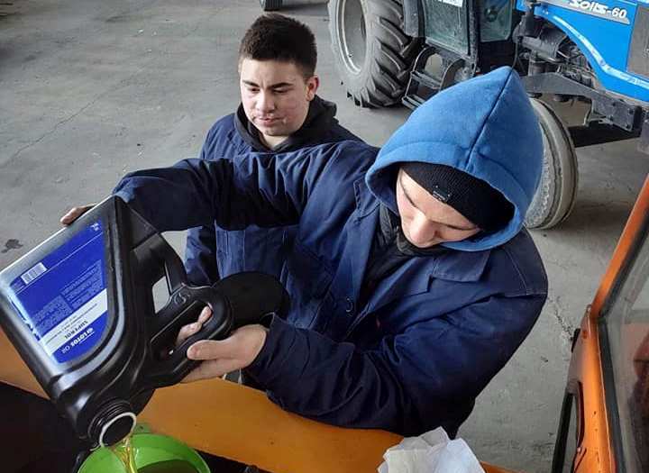 Uczniowie klasy III Technikum Agrobiznesu dbają o terminowość obsługi i wymiany materiałów eksploatacyjnych w ciągnikach szkolnych w ramach zajęć praktycznych.